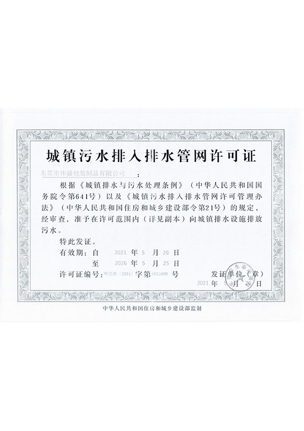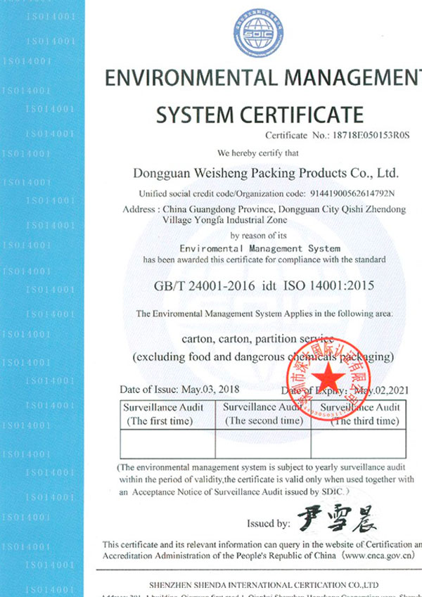 伟盛公司地已获得国家环保认证企业, 已通过 ISO 14001 环境体系认证 及 ISO 9001 质量管理体系认证
